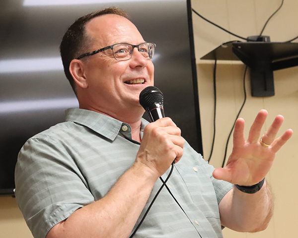 Schreiner, the Green Party chief, gave about 30 members of Dresden CARED and the community the same message July 11 at the Dresden Legion.